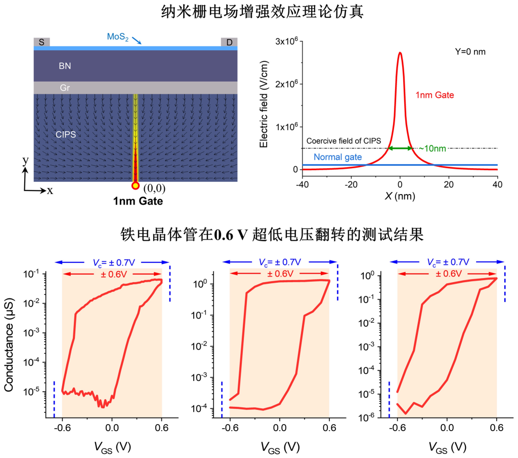 铁电晶体管利用铁电材料的极化翻转实现数据存储,是后摩尔芯片技术中极具潜力的半导体存储器,受到学术界和业界广泛关注。凭借极化双稳态存储机制和三端晶体管结构,有望构建非易失性存算一体架构,实现存储与高速计算的完美结合,是破解“存储墙”和实现人工智能底层架构革新的关键新技术。然而迄今为止,受限于平板铁电体矫顽电压的物理限制,传统铁电晶体管仍需用1.5V以上电压实现铁电极化翻转和数据擦写。尽管优于Flash,但常规铁电晶体管理论上无法降低电压到0.7V以下,即无法匹配到逻辑电压水平。如何实现亚0.7V的超低电压存储技术,是突破存储墙瓶颈和提升AI芯片算力的关键。